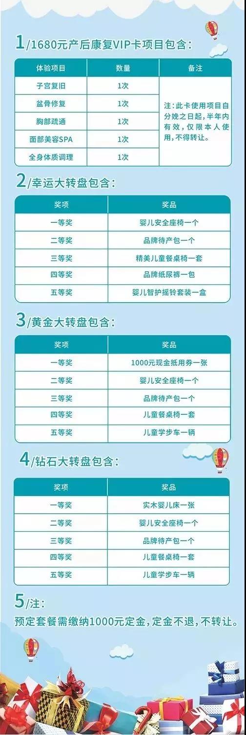 39800豪华VIP:一重礼8折优惠+二重礼钻石大转盘+三重礼月子中心入住加赠5天或价值1680元产后康复VIP卡